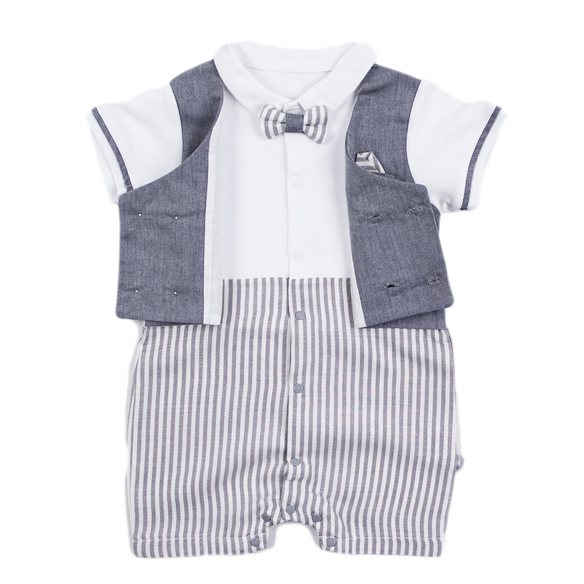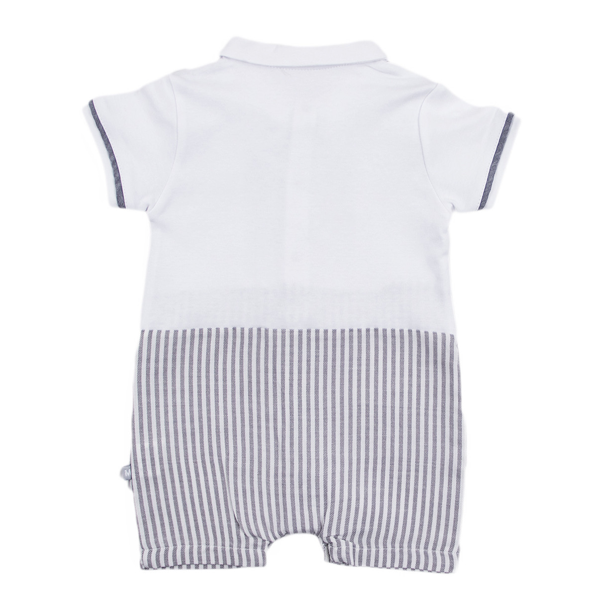 - Горната част имитира елек, който може да се разтваря с четири копченца, като дава достъп да бъде разкопчан гащеризонът.